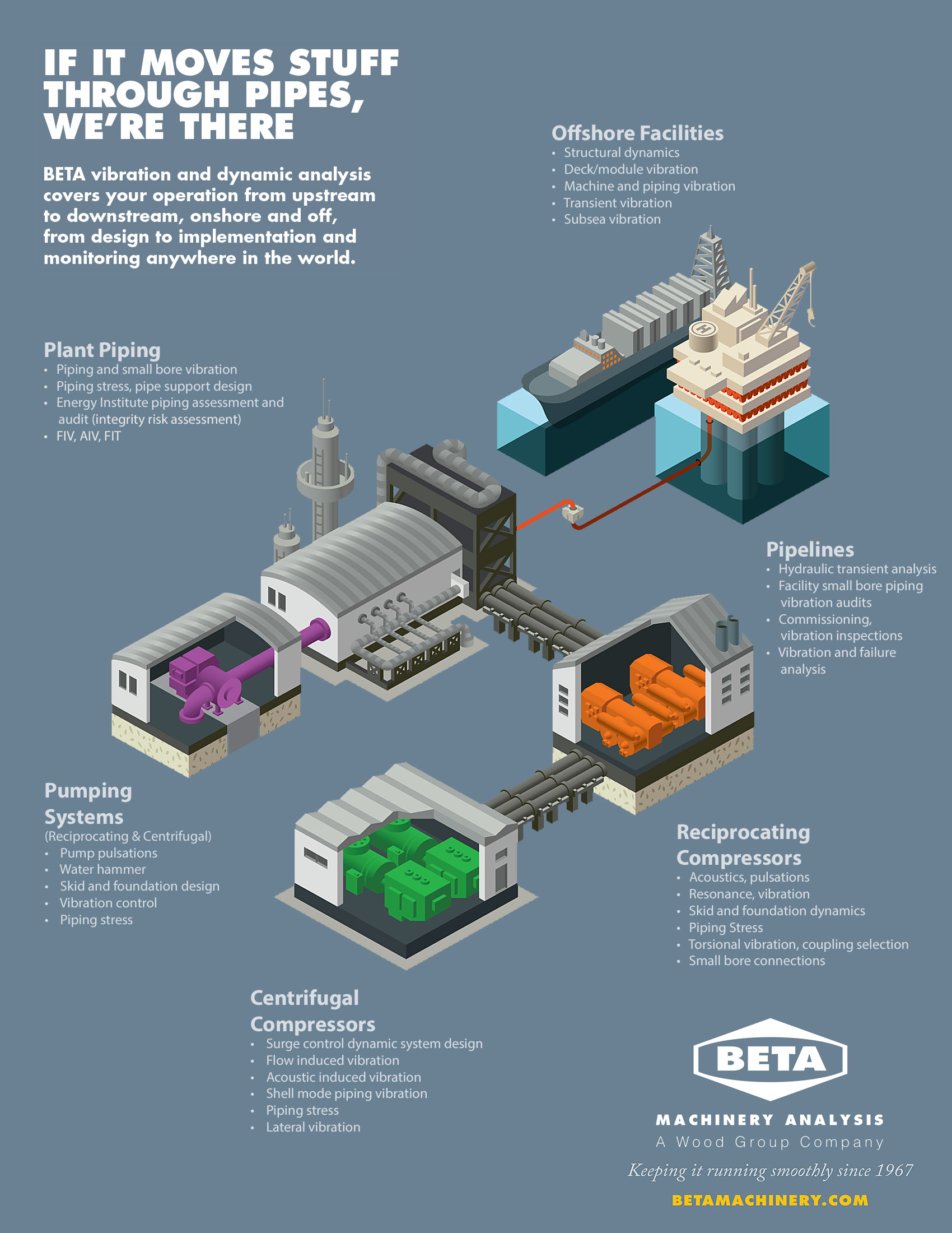 Vibration is a costly issue for facilities employing compressors, pumps, and large piping systems. Excessive vibration leads to fatigue failure in pipes and vessels, resulting in leaks, fires, downtime, safety, environmental, and operational consequences.Our services support the entire lifecycle of a production facility: