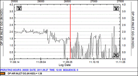 Air inlet differential pressure had been quite steady at 1.5 – 2.0 in. H2O. Then, near the end of September, 2011, the reading started to vary, from about 2 in. H2O down to zero.