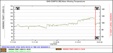 | Observation/Action | B1105, created Jan 16, 2012. Unit B motor winding temps reached 116 °C and were rising steadily. Unit A motor winding temperatures were about 95 °C, and unit C motor about 85 °C. |