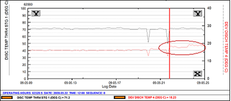Rather than monitoring raw temperature data, the following chart is based on a derived measure called “discharge temperature deviation.” The “deviation” is the difference between expected versus measured discharge temperature.